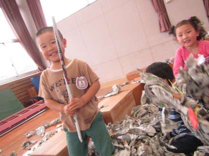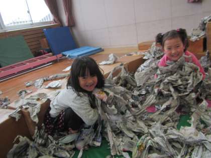 遊んでいると遊戯室が新聞紙だらけになりますが,子どもたちはそれらをあっという間にきれいにしてしまいます。集めてきて片づけることも子どもたちの得意なことであり,好きな遊びでもあります。