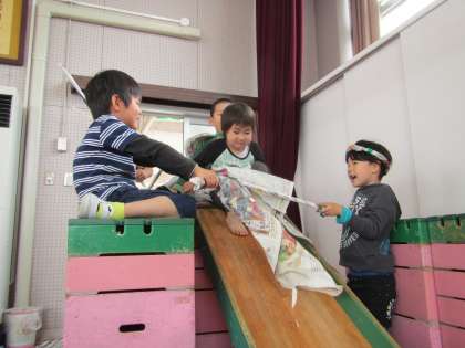 今日も,すみれ組の子どもたちは大型積み木で飛び込み台付の新聞プールをつくって,潜ったり,投げたりして遊んでいました。
