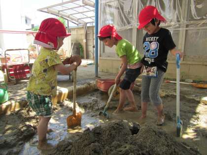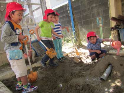 雨も続いて,遊戯室で大型積み木や新聞紙で遊ぶことが多かったすみれ組でしたが,今日はとてもいい天気!すみれ組の男の子たちは外で砂で山をつくったり,水で川をつくったりして遊んでいました。