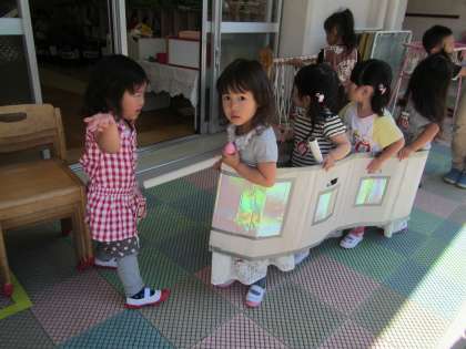 途中、たんぽぽ組のお兄さん踏切や友達踏切が「カンカン カンカン」と言って立っていると,ちゃんと止まって開くまで待っている姿もかわいかったです。