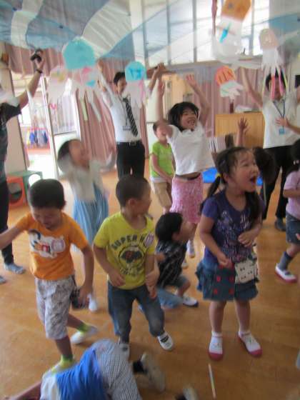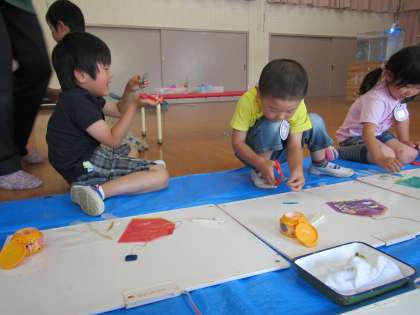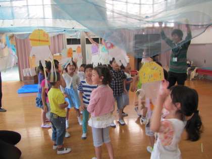 5月20日 すみれ組 〜移動水族館 その2〜 公開日 2016/05/24 更新日 2016/05/24 幼稚園では・・・ クラゲを見た後に,年長組はクラゲづくりのワークショップがありました。 自分で選んだクラゲに,色紙やリボンで飾り付けをさせてもらいました。それぞれ,細かい模様をつけたり,触手をつけたりそれぞれ素敵なクラゲができました。 出来上がったクラゲは布にぶら下げて,一緒に海に潜って遊ぶ時間もあり,特に子どもたちは大喜びです。 出来上がったクラゲは家にお土産で持って帰りました。