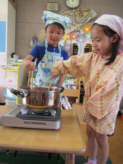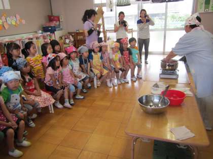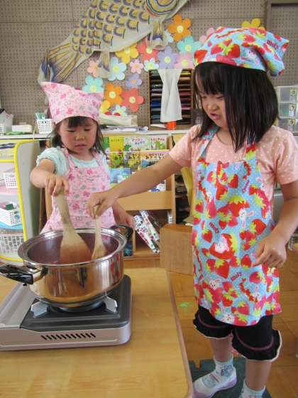 イチゴの形が煮詰めるにつれて無くなっていき,トロトロになる様子を話をきいたり,混ぜたりしながら見つめていました。また,煮詰めるとイチゴのいい匂いが保育室に広がりました。すみれ組の保育室がイチゴのにおいで充満したので「これじゃあ、すみれ組じゃなくてイチゴ組やな」と笑って話していました。