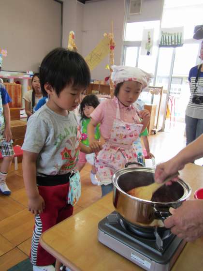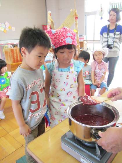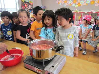 すみれ組の保育室で,イチゴジャムづくりをしていたので,イチゴジャムのいい匂いが幼稚園に広がりました。