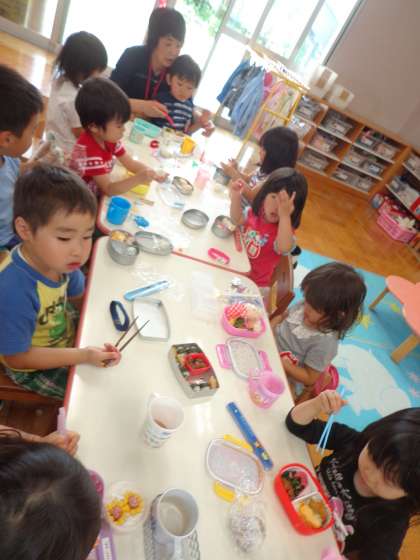 昨日,初めて幼稚園でお箸を使ってお弁当を食べました。お友だちと話しながら楽しそうに食べている子ども,お弁当のおかずを床に落としてしまった子ども,「いただきます」の前にお弁当を食べ始めてしまった子ども,お箸の使い方に苦戦していた子どもなど色々いました。また,幼稚園で栽培した豆で作った豆ごはんの小さなおにぎりにも挑戦しました。「お豆のごはん苦手やねん。」と言いながら,パクパクっと食べて「全部食べれたよ。美味しかった!」と言っていた子ども,オエっとなりながらも少しだけ頑張って食べて「もう,食べれない。」と言ってきた子ども,様々でしたが色んな食べ物を知る良い機会になったと思います。