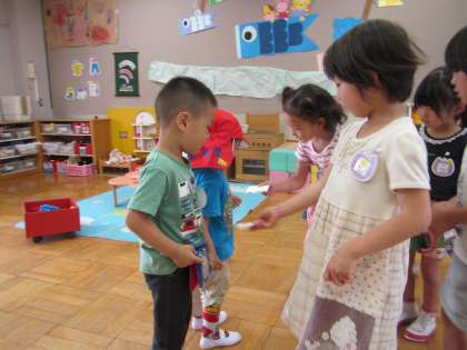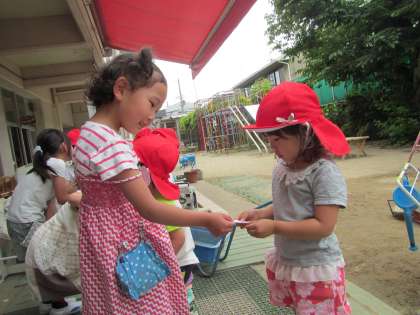 今日はイチゴジャムパーティーです。すみれ組の子どもたちはつくったチケットを、ちゅうりっぷ組とたんぽぽ組に配りに行きました。