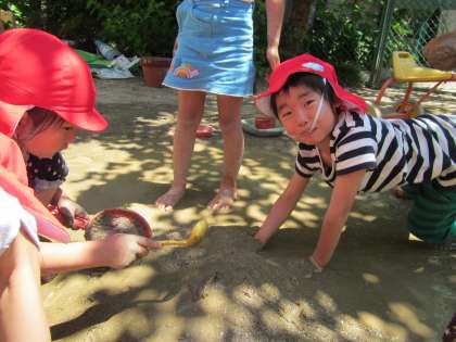 桜の木の近くではどろどろになった地面の土をかき集めて、大きな大きな土のプリンをつくって遊んでいました。かき集める時には手の力や腕の力が必要です。また、プリンの元(とろとろの土)を混ぜる時は、大きなプリンなので手で大きく混ぜなければ混ざりません。子どもたちは、いつも以上に体を大きく動かして土のプリンづくりを楽しんでいました。
