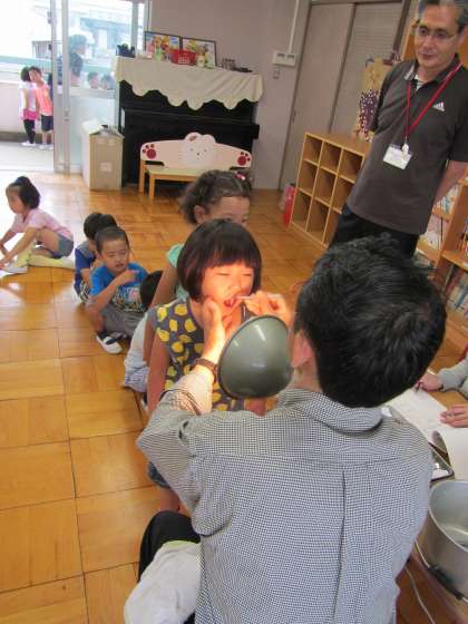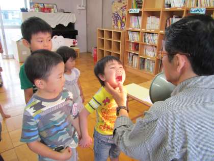 歯科検診 公開日 2016/06/09 更新日 2016/06/09 幼稚園では・・・ 今日は朝から歯科検診がありました。 1学期の検診は,歯科検診が最後です。ちゅうりっぷ組の子どもたちも,すみれ組のお兄さんお姉さんに連れられて,落ち着いて検診を受ける姿が多くなってきました。 たんぽぽ組とすみれ組の子どもたちも,大きな口を開けて検診を受けていました。