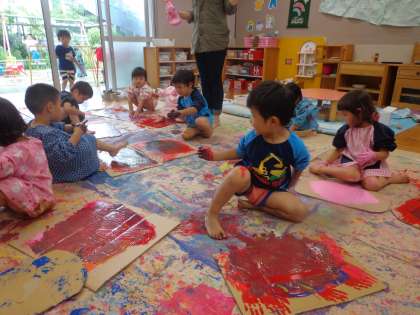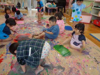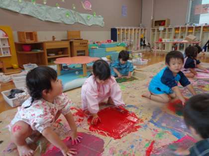 絵の具あそびをしました。自分の好きな色を先生に出してもらって,段ボールの上いっぱいに絵の具を塗ったり,色を混ぜ合わせたりしました。好きな色を先生に必死に伝える子どもたちの声が部屋中に響いていました。始めは手のひらで塗っていたのですがだんだん楽しくなってきた子どもたち・・・,足の裏でも絵の具のヌメヌメやドロドロの感触を味わい始めました。段ボールの上で感触を味わいながらお尻を振り出す子どももいました。絵の具あそびで感じた楽しさをお尻で表現してくれたのかなとも思います。これからもっともっと色んな感触を味わっていこうね!