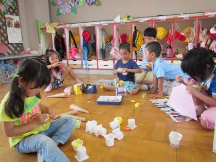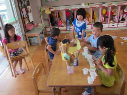 昨日つくっていた子どもが,今日もつくりはじめると「入れて」「やりたい」と一緒につくりたい友達がたくさん入ってきて,コーンのアイスやカップのアイス,トッピングアイスなどたくさんのアイスクリームができました。