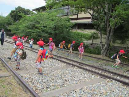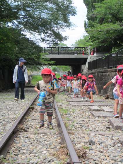 帰り道は,インクラインを歩きました。昔,船を運んでいた線路が残っている場所ということを先生から聞き,電車になって線路を歩いたり,横の石の上を跳んで進んだり,インクラインの道を楽しみました。