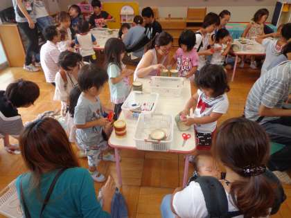 11日は土曜参観でした。いつもは幼稚園で一緒に遊ぶことのない,お父さんやお母さんと一緒に竹こっぽりをつくって遊んだり,遊戯室で踊ったりして楽しみました。いつもの生活の様子も見てもらったのですが,お家の人が見守ってくださっていたおかげなのか,いつもと違ってみんなテキパキとお帰りの準備もできました。子どもたちは自分だけの竹こっぽりができ,すごく嬉しかったようです。ありがとうございました。