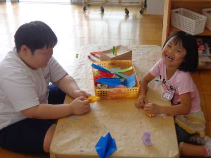 中学生の職場体験最終日でした 公開日 2016/07/01 更新日 2016/07/01 幼稚園では・・・ 3日間の中学生職場体験が今日で終わりでした。短い期間でしたが,いっぱい一緒に遊んでもらって,子どもたちはお兄さん先生とお姉さん先生が大好きです。今日でお別れなので,寂しさを感じている子どももいました。 中学生のお兄さんお姉さんも,子どもたちと遊んで遊んだり,生活したりする中で学びがたくさんあったようです。幼児と中学生互いに,よい3日間となったように感じます。