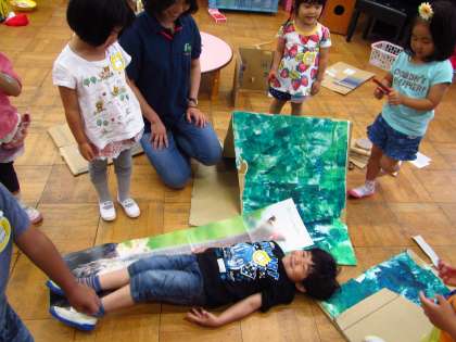 動物園への園外保育を予定していたのですが,雨が降り出して延期になってしまいました。「行きたかったなぁ」「動物,見たかったなぁ」という声がたくさん聞かれました。その思いを受けて,えほんの棚に出していた動物の観察絵本をテーブルにたくさん並べてみました。行きたかった思いが,今まで以上に動物への興味を高めたようです。「こんなん,あるよ」と見ているうちに,Aちゃんが実物大のページを広げて,ダチョウの頭から首の横に寝転びました。「見て!見て!」の声に次々と友達も集まってきて,代わる代わる背比べが始まりました。ますます,楽しみになってきた動物園,今度こそ,お天気になりますように。