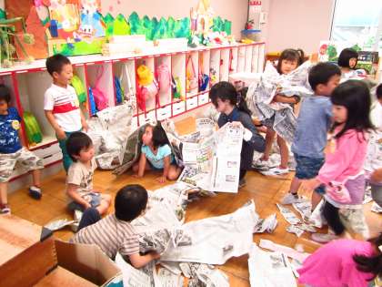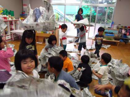 雨降りで外に出られない分,室内でも思い切り発散できるように,新しい素材との出会いができるように・・・,と願って,たくさんの新聞紙を用意しました。まずは,広げて新聞を被ってかくれんぼ,次々と新聞を増やしていくと,新聞の上を泳ぐように飛び込んでいったり,投げ上げたりして歓声をあげていました。遊んでいく中で,新聞紙が揉まれている音を聞いたり,軟らかくなっていくことを肌で感じたり,破れて形状が変化していったりなどの刺激も受けとめて素材体験も広がっていくことと思います。思い切り遊んで満足した子どもたちは,また遊ぶことを楽しみにして新聞紙を集めていました。