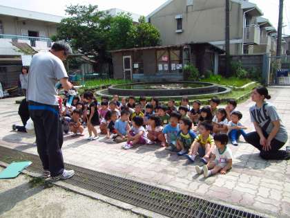 3歳児ちゅうりっぷ組の子どもたちも幼稚園になれてきたので,今月は,小学校の校庭への避難をしました。3歳児は,先生の周りに集まって,4歳児は,登園してすぐに,火災発生時の約束(1番近くの教職員のところへ行く・「おさない・はしらない・しゃべらない・もどらない・ては口に」)を確認して,5歳児は全く予告なしに,と年齢に合わせての避難訓練をしました。