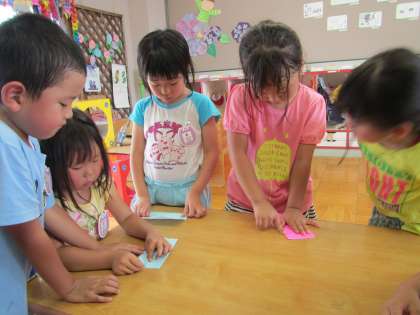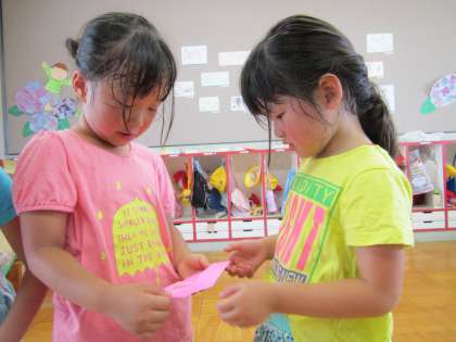 すみれ組 その1 〜子ども先生〜 公開日 2016/07/04 更新日 2016/07/04 幼稚園では・・・ 今日も七夕の飾りつくりの時に,子ども先生が友達につくり方を教えてくれていました。1人は嬉しくて目の前で見守っている先生に「ねぇ,○○先生になったよ」と自分の名前の後に先生をつけて繰り返し言いながら喜んでいました。もう1人は,教えてあげなきゃと一生懸命自分なりのわかりやすいつくり方を友達に伝えようとしていました。