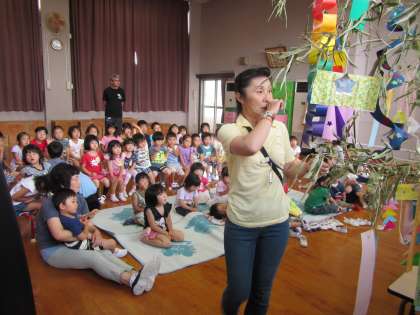 七夕の集い その1 公開日 2016/07/07 更新日 2016/07/07 幼稚園では・・・ 今日は七夕の集いがありました。みんなで集まって,七夕の歌を歌ったり,七夕の物語をみたりして夜空に思いをはせながら,楽しいひと時を過ごしました。子どもたちが心の中で願い事をしたり,話しかけたりしていると,どこからかシャララランときれいな音が聞こえてきました。そして,遊戯室の窓のところにお星さまからのプレゼントがひっかかっていて,子どもたちはとても驚いていました。