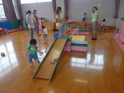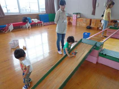 今日のうさぎ組は,遊戯室で巧技台を組み合わせて,登ったり,おもちゃを転がしたりして遊びました。今日も蒸し暑かったけど,天気が雨模様だったので,水遊びができず,残念だったね。