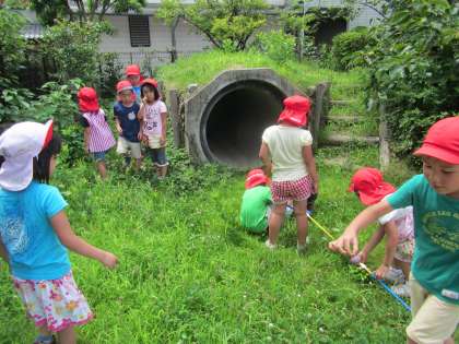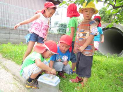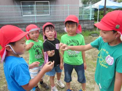 園庭でのセミ捕りから,てんとうむし広場でも虫探しがしたいという子どもたちの希望もあり,築山で虫探しをして遊ぶことにしました。一歩草むらに踏み込むと,大きなバッタがたくさんジャンプして「バッタいた!」と,子どもたちはそこからバッタ探しを始めました。バッタを探しているかと思えば,目の前をチョウが飛ぶと「チョウチョ!」と,周りの友達みんなでぞろぞろとそのチョウを追いかけます。周りで動く虫1つ1つに反応して,虫たちに夢中な子どもたちがとても可愛かったです。