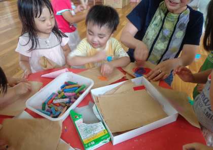 積み木で電車をつくってみんなで乗ったり,消防隊になって幼稚園中の火を消してまわったり,すみれ組のアイス屋さんに行ったり,大忙しの子どもたちでした。美味しそうに,アイス屋さんから帰ってくると,「私たちもアイス屋さんする!」と紙にクレパスでいろいろな色を塗って「メロン味〜。」「私はいちご味!」「私は,りんご!」「これは,みかんだよ!」といろいろな果物ができてきました。すると,子どもたちは,果物屋さんをはじめました。