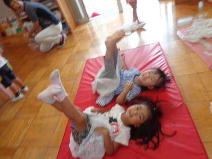 鉄棒や平均台を使ったりして遊びました。色んなものに興味がある,ちゅうりっぷ組の子どもたち。目に入ったものや友達が遊んでいる姿を見ると「○○もやる〜!」と積極的に遊びに参加していました。保育室でもゲームボックスやマットを使って,いっぱい身体を動かしました。マットの上で友達と一緒に並んで寝転びながら「人魚やで〜」と,しっかり足を組んで人魚の尾びれを表現しながら,人魚になりきっていた子どもの姿も可愛らしかったです。