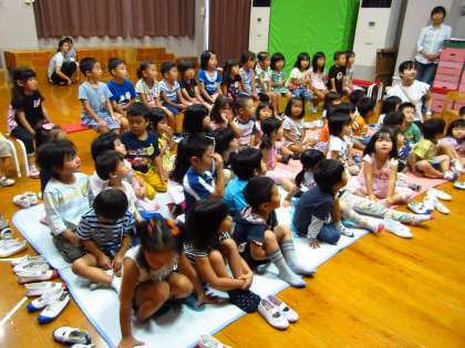 今日は,遊戯室に集まって,幼稚園のお月見の集いをしました。お月見で供えるススキのいわれを聞いたり,ブラックライトのパネルシアターを見たりしました。月見団子が食べたくてタヌキが化けたお月様に子どもたちはつぶやいたり呼びかけたりしていました。