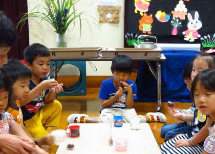 その後は,京菓子處の鼓月様からいただいた月見団子をみんなで味わいました。お団子や餡子が大好きな子どもたちは,こぼれるような笑顔でほおばっていました。もっちりした食感が苦手だったり手が出にくかったりした子どもも,友達の様子を見ながら口にする姿や食べられるようになってきた姿が見られました。幼稚園の行事で繰り返しお餅や和菓子と出会ってきたことの積み重ねかと思います。伝統的な行事の食をみんなで楽しむとともに,食の幅も広がっている姿はうれしいことでした。
