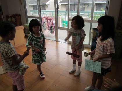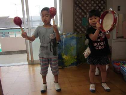 すみれ組 その1 〜楽器で遊びました〜 公開日 2016/09/14 更新日 2016/09/14 幼稚園では・・・ 先週,幼稚園で吹奏楽のコンサートを聞きました。本物の楽器の音に触れた子どもたち。楽器に興味をもっているだろうと,保育室に楽器を出しました。すると,子どもたちはすぐに楽器が出ていることに気が付きました。音楽をかけると,それに合わせて楽器を鳴らすことも楽しんでいました。自分で鳴らしてその音を聞いて,嬉しそうな表情をしていました。