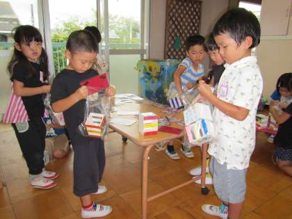 すみれ組 その2 〜プレゼントを自分たちで包んだよ〜 公開日 2016/09/14 更新日 2016/09/14 幼稚園では・・・ 自分たちでつくったプレゼントを自分で包みました。袋に入れたり,ボールで袋の口を縛ったり自分たちですべてしました。おじいちゃんおばあちゃんが喜んでくれるといいなと思いながら,丁寧に包んでいる子どもたち,明日の祖父母参観が楽しみですね。