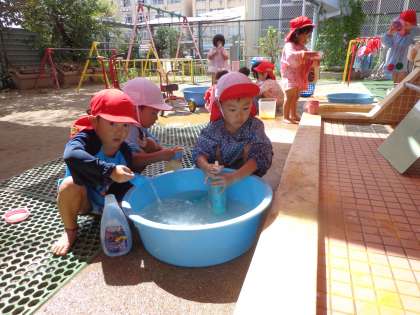 色を混ぜることが楽しいちゅうりっぷ組の子どもたち。大きなタライや,空のプラスチック容器に色んな色の水を入れて混ぜたり,振り撒いたりして楽しそうでした。