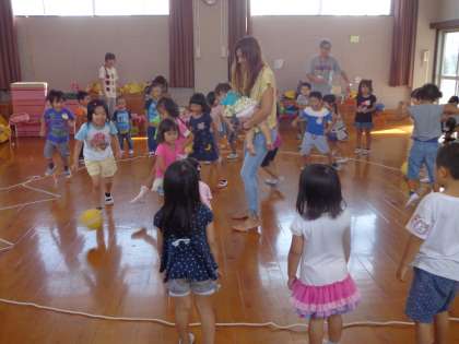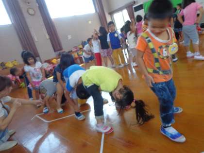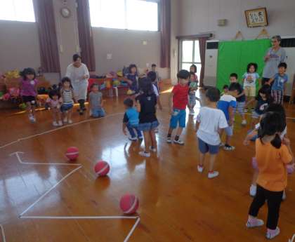 預かり保育 「ボールで遊ぼう!」(9月16日) 公開日 2016/09/16 更新日 2016/09/16 幼稚園では・・・ ボール送りゲームをしたり,ころがしドッヂをしたりして遊びました。ボール送りゲームでは,前と後ろに気をつけながら,自分のところにボールがくるのを,まだかまだかと待っていました。転がしドッヂでは,線の外から転がってくるボールを跳んだり,横に避けたりして楽しそうに身体を動かしていました。 ボランティアをして下さった保護者の皆様、ありがとうございました。