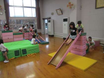 すみれ組の子どもたちと一緒に積み立てた巧技台。自分たちが遊びたい滑り台やはしごも出してきましたが,その中で「ちゅうりっぷさんもいるもんな」と,高さや登る階段などをつくっている姿が見られました。子どもたちから,小さい組の子どもたちのことを考える姿が出てきたことが,とても嬉しかったです。