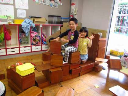 遠足,交流保育と行事が続きました。今日は,ゆったりと幼稚園で遊びました。Aちゃんが始めた遊びは,積木のトロッコ列車つくりでした。トロッコ列車ができあがると,「お客さんはここに座ってください」と呼び込みました。みんなで出かけた遠足は,すぐに遊びのイメージが伝わっていくようです。「はーい」とすぐにお客さんが乗り込みました。つくって遊ぶコーナーでは,切符づくりや川原で遊んだことを小さい紙芝居につくっている子どももいました。好きな遊びに,共通の経験が重なって,新しいごっこ遊びにつながっていくようです。この遊びがどのように進んでいくのか,楽しみです。