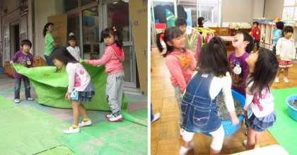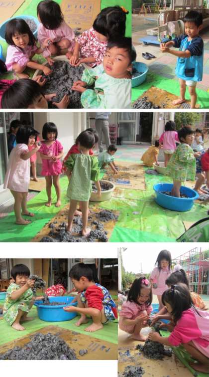 前日に遊んでつくった新聞紙の粘土,登園するとすぐに遊びたい子どもたちが,シートを敷いたりタライを運んだりし始めました。たっぷり新聞紙粘土が入った重たい重たいタライも友達と一緒に運んでいく姿には,びっくりしました。遊びたい意欲は,友達と一緒にスゴイ力を発揮するのです。スモックに着替えた子どもから,ペタペタして遊んだり,タライに入って足で感触を楽しんだり,お団子や山,パフェなど好きな物をつくっていきました。そして,ついには投げたくなって,段ボールの大きい箱を的に見立てて,投げつける遊びまで始まりました。たくさんの新聞紙粘土で,全身で思い切り遊ぶことができました。