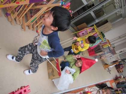 12月に入り,サンタクロースに思いを寄せる子どもたちです。友達と力を合わせて,サンタの帽子をつくった子どもを中心に,プレゼントを袋に詰めてサンタごっこが始まりました。