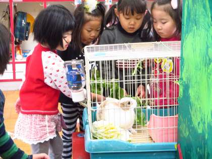 年末から,夜の冷え込みが厳しくなってきました。今,幼稚園のうさぎは,らびちゃん1匹だけなので体を寄せ合うことができません。凍えてはかわいそうなので,夜は室内で過ごすようにしてきました。先週までは,ちゅうりっぷ組や職員室にいたのですが,今週から,たんぽぽ組で過ごすことにしました。昨日は,登園するとらびちゃんが迎えてくれて,びっくりしたり嬉しくなったりしていたたんぽぽ組の子どもたちでした。今朝は,保育室に入るとまっすぐに「らびちゃん,おはよう」とうさぎのところへ行く子どもがたくさんいました。「朝ご飯,みんなであげようか」と人参スティックを用意すると,自分の手かららびちゃんが食べてくれるのを,とても喜んでいました。人参がなくなると,用務員さんの所まで「らびちゃんのお野菜ください」と今度は大根の葉っぱをもらってきていました。らびちゃんの体に触れて「らびちゃん,あったかい」と笑顔がこぼれています。