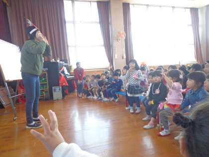 豆まきの豆を玄関ホールで炒りました。すみれ組が豆を炒り,その様子をたんぽぽ組とちゅうりっぷ組は見ていました。「いい匂いだね〜」と豆の香ばしい匂いを嗅いだり,「この匂いは何の匂い?」と先生からのクイズをしたりしました。「ポップコーンの匂い!」,「おもちの匂い!」と様々な答えが出てきました。もう一回先生が「おもちにかける粉の匂いだよ。さて,何でしょう?」と問題を出すと,「きなこ!きなこの匂いや!」と子どもたちは喜んでいました。また,炒っている豆になって転がったり,丸くなったりして楽しむ姿もありました。豆を炒り終わると,みんなで遊戯室にいって,節分の話を聞いたり,「豆まき」の歌を歌ったり,豆を食べたりして節分の集いを楽しみました。