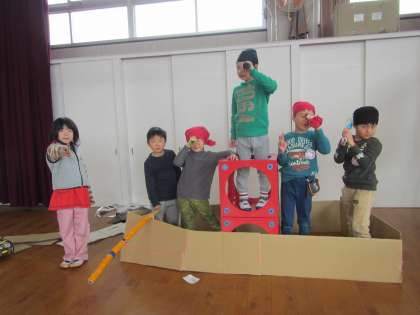 すみれ組では海賊ごっこが盛り上がっています。頭に布を巻いて,自分でつくった望遠鏡や剣を持って,冒険の準備をしています。今日は,冒険に出かける船をつくっていました。船には見張り台の他に,ピザ釜までついているそうです。おしゃれですね。
