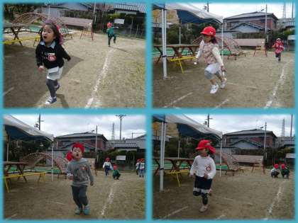 「先生,マラソンいこー?」,「ほんまや!マラソンしたい!」と,やる気満々の子どもたち。てんとうむし広場で,みんなで思いっきり走って楽しみました。知らない間に,子どもたちの体力がついていて,先生も驚きました。「いつの間に,みんなそんなに走れるようになったの?!」と先生が聞くと,「毎日,寝てる間に力がついたねん!」,「いっぱいご飯食べてるからやで〜!」と,自慢げな顔で言っていました。前回の保健指導の話も,しっかり覚えているんだなと感心しました。