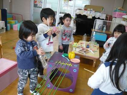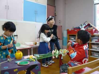 前の日に「焼き鳥屋さんがしたいな。」と子どもからリクエストがあったので,焼き鳥を焼く台を部屋に用意しておくと,それぞれが割り箸や紙で焼き鳥をつくって焼き始めました。「いらっしゃい!いらっしゃ〜い!」,「1つください!」「いっぱいください!」と子どもたちの楽しそうな声も聞こえてきました。焼き鳥屋の前にはカレージュース屋さんもできて,それぞれ子どもたちがごちそうをつくったり,呼込みをしたりしていました。すみれ組のお兄さんたちも一緒に遊びに来てくれて,とても嬉しそうな子どもたちでした。