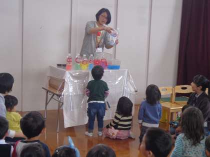 4月27日(木),4月生まれの誕生会を行いました。4月生まれの子どもたちの紹介とお祝いの歌の後,那須先生がペットボトルを透明人間に見立てて,色水のジュースを飲ませました。始まると,話声が聞こえていた子どもたちでしたが,ペットボトルと色水を集中して見つめていました。