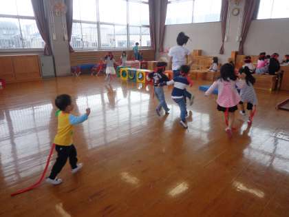 子どもたちは,砂場や乗り物で遊んだり,遊戯室でしっぽ取りをしたり,保育室で遊んだりと,自分の好きな遊びを楽しみました。