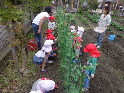 また,てんとうむし広場で育てているスナップエンドウの収穫に行きました。大きく育っているスナップエンドウをハサミで切って,たくさん収穫できました。まだ,花が咲いているので,これからも収穫できるね。