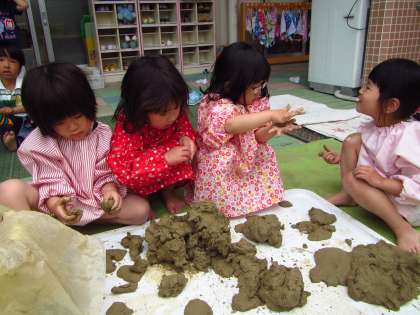 ちゅうりっぷ組の子どもたちは,幼稚園でいろいろな遊びに目が向くようになってきました。子どもたちの好きな遊びの一つになるようにと願って,テラスに土粘土のコーナーを設定しました。興味をもった子どもたちは,「スモックを着て,裸足になったら遊べるよ」と誘うと,「わかった」「やる」とスモックを着て遊び始めました。手のひらにのせて転がしたり,手にとってはくっつけたりして,軟らかい感触を楽しんでいるように見えました。