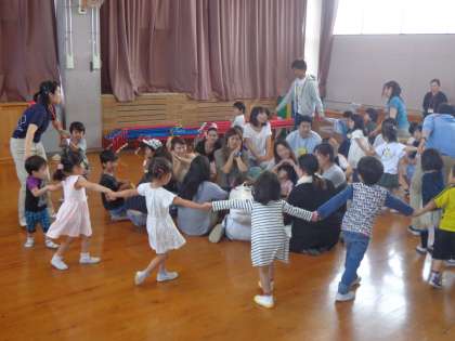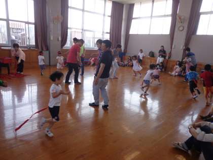 後半は,「お家の人と遊ぼう」で,クラス毎に遊戯室で子どもとお家の人とで遊びました。