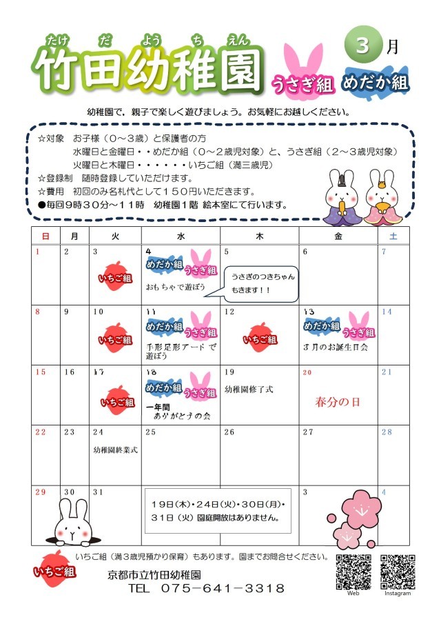 3月の「めだか組うさぎ組」案内です。ぜひ遊びに来てください。