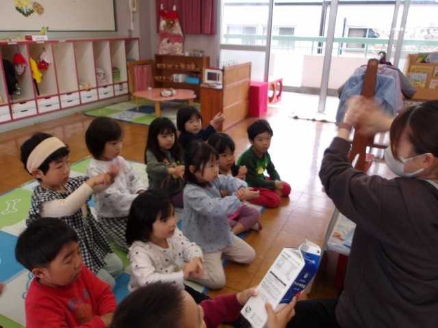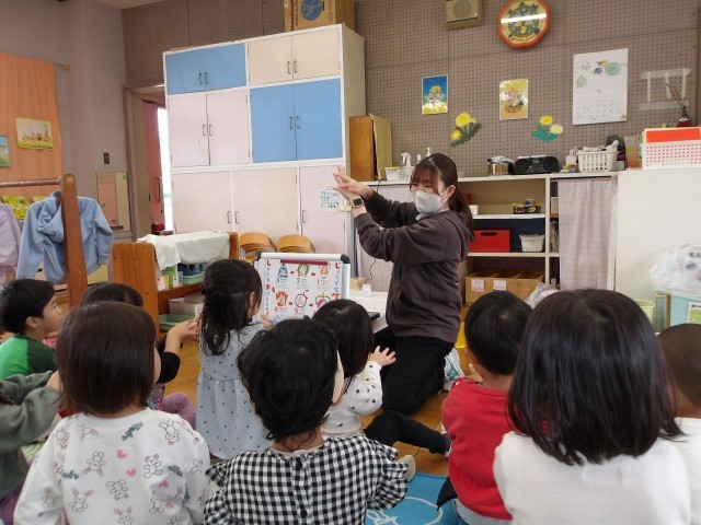 普段は手洗い場に掲示している「じょうずな手の洗いかた」というものを使いながら、「あわあわ手洗いのうた」にあわせて手を洗う練習を行いました。