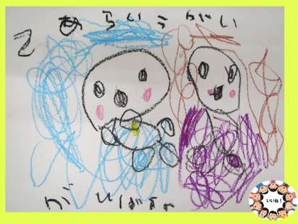 早く幼稚園で虫取りがしたいと,幼稚園に行くのを楽しみにしています。みんなで早く幼稚園で遊べるように,家でも手洗いうがいを頑張っています。お母さんと一緒に手洗いうがいをしているところをかきました。