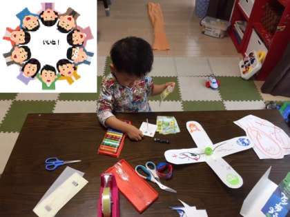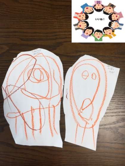 「先日配って頂いたDVDを観ながらダンスをしたり、タオルの上を歩いたり、手作り絵本のクラゲを真似して描いたり、独楽を作ったりしています。