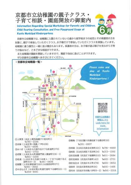 京都市立幼稚園の親子クラス・子育て相談・園庭開放の御案内(6月号)です。